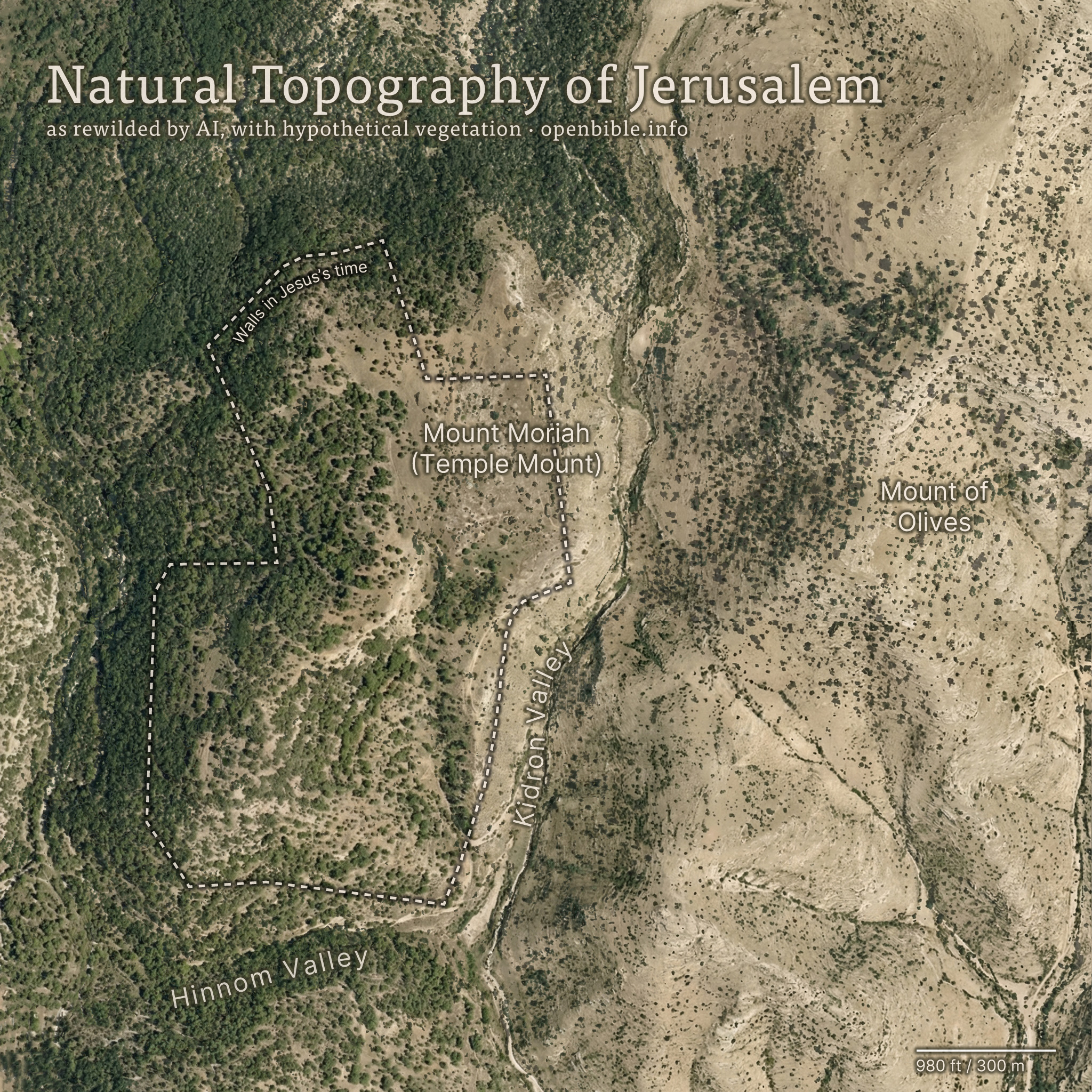 Here the rewilded landscape is misleading—during the time of Jesus (which the above image depicts), the area around Jerusalem was less forested than this image suggests. The area included agriculture, roads, pasturelands, and other changes introduced by humans.