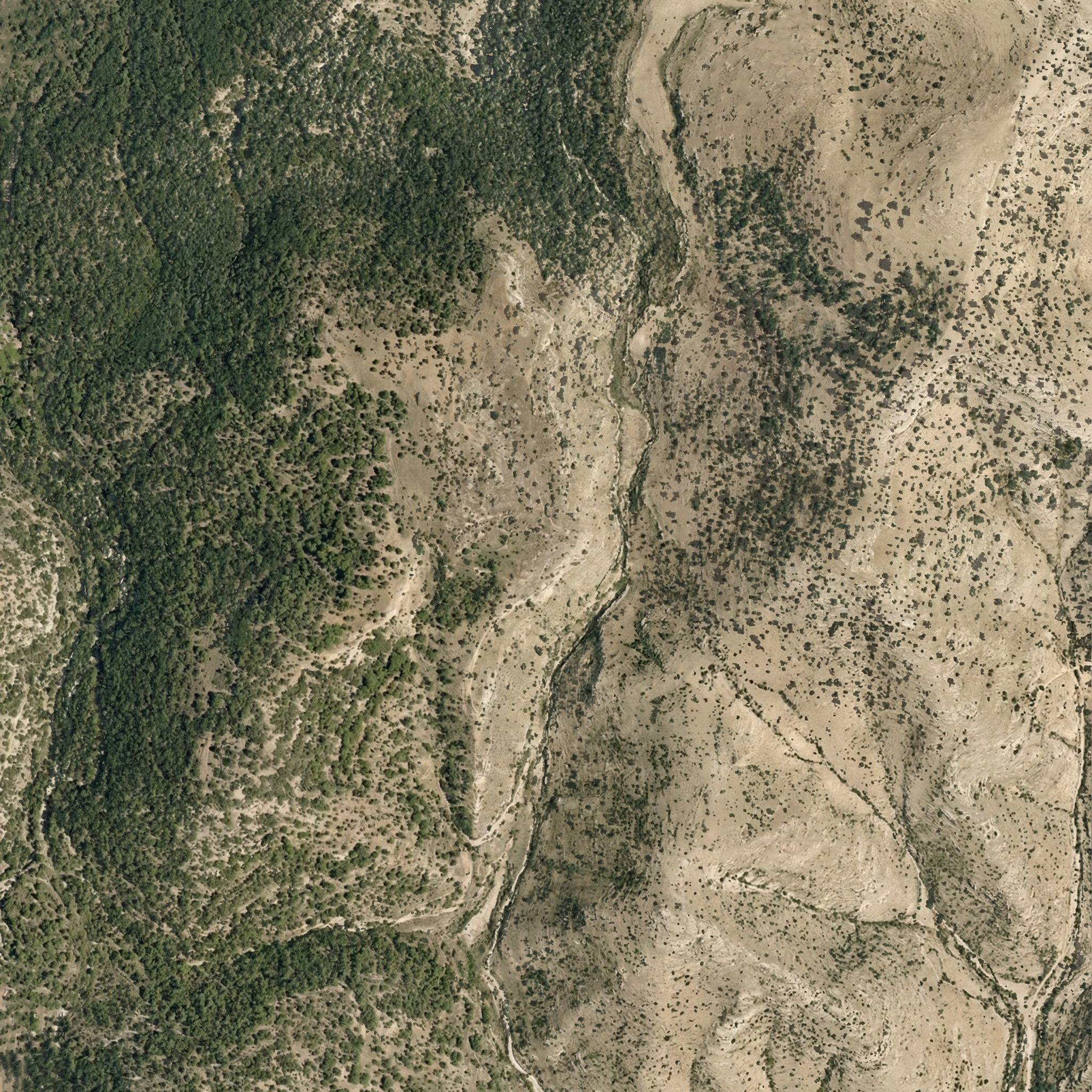 This is a detailed map of the area around Jerusalem. Convert it to an overhead aerial view. Preserve all the topography exactly. Remove all text. Apply landcover (especially trees and scrub) in a naturalistic fashion and show bare dirt, light scrub, and trees where hydrologically appropriate.