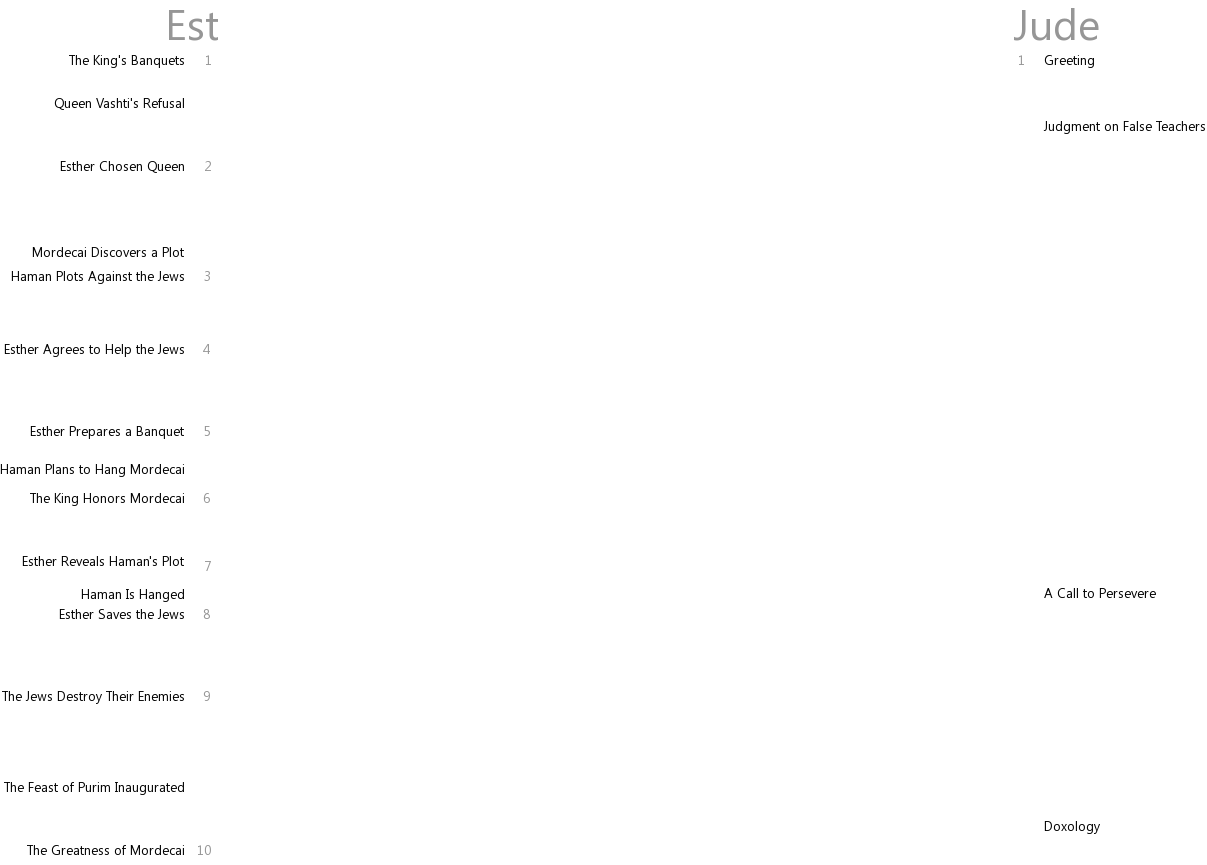 The source of each cross-reference is on the left; the target is on the right. The first verse in the book or section is at the top, and the last verse is at the bottom. Numbers indicate chapters. Section titles are from the ESV Bible.